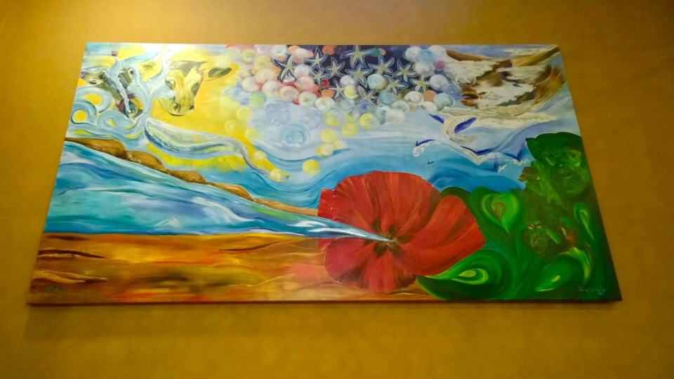 Voor mij is dans en beweging een must om te doen, dit komt terug in mijn schilderijen, mijn kwast danst over het doek. In de opdracht lag de vraag over een modern schilderij, wat toch de oudere generatie zou aanspreken. Zo ontstond de klaproos op mijn doek, het strand, de zee en de duinen, de apen en vogels, de zon en de maan, de os, de wind, de sterrenhemel en zoek het clowntje. Het merendeel van dit doek zette ik onbewust op, de werkwijze die ik, sinds 2002, het liefste doe.